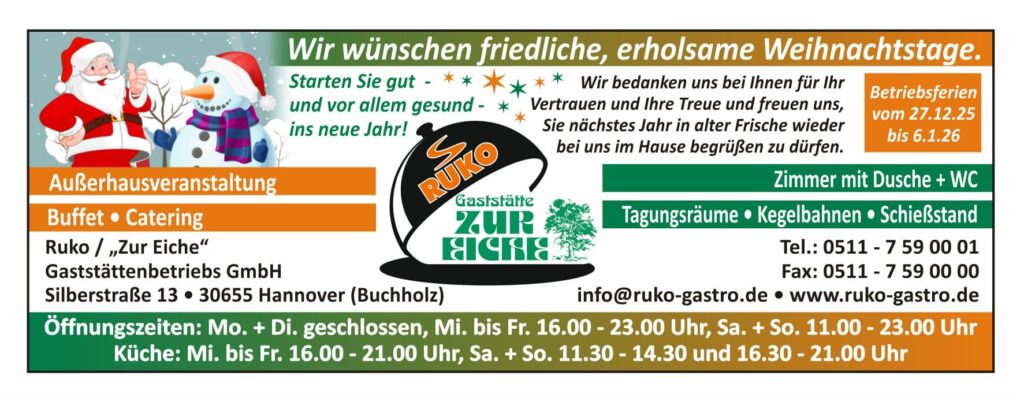 ab dem 01.01.2025 – 08.01.2025 machen die Gaststätte „Zur Eiche“, sowie der RUKO – Partyservice Betriebsferien.
