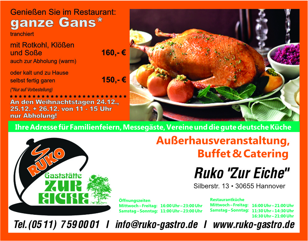Genießen Sie im Restaurant: ganze Gans* tranchiert mit Rotkohl, Klößen und Soßeauch zur Abholung (warm) 160,00 € oder kalt und zu Hause selbst fertig garen 150,00 € (*nur auf Vorbestellung) An den Weihnachtsfeiertagen 24.12., 25.12. + 26.12.von 11:00 Uhr bis 15:00 Uhr nur Abholung!
