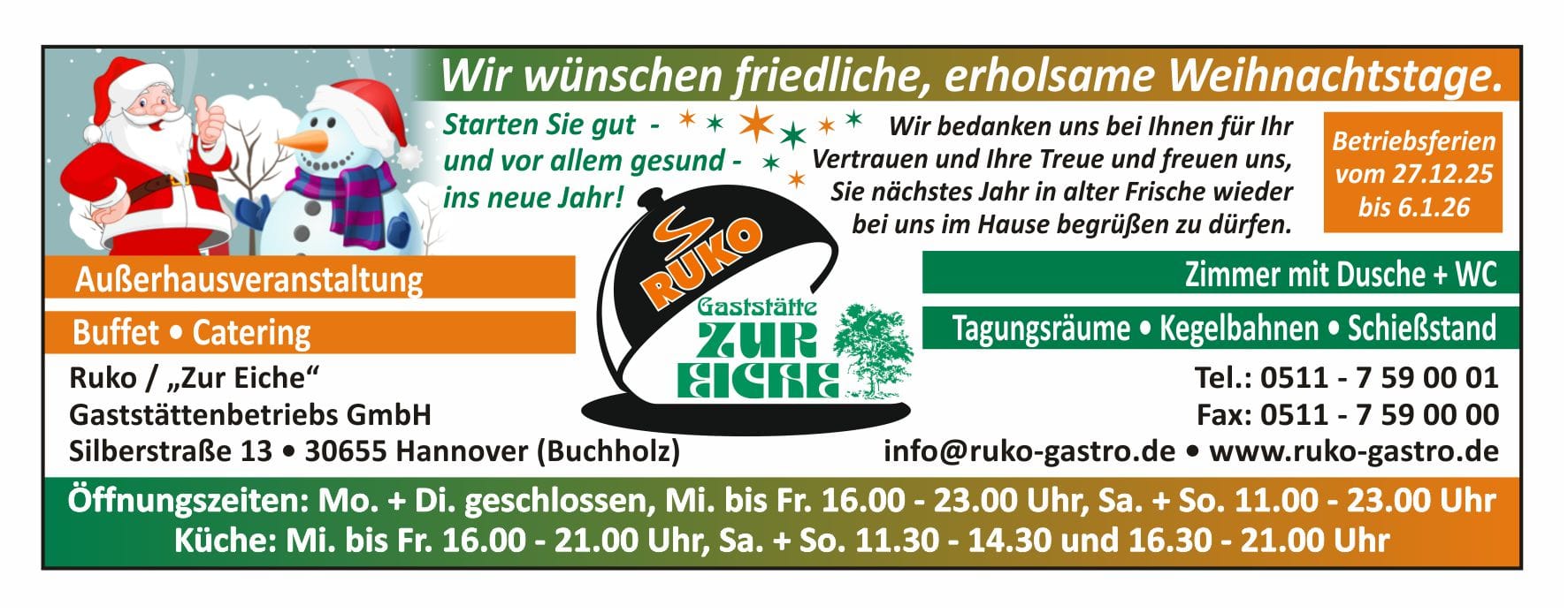 22.12.2025 und 23.12.2025 Geschlossen 24.12.2025 – 26.12.2025Geschlossen, nur Abholung der reservierten Bestellungen 27.12.2025 – 06.01.2026Betriebsferien – Geschlossen ab dem 07.01.2026 sind wir wieder wie gewohnt für Sie da. Wir möchten die Gelegenheit nutzen, um Ihnen frohe Festtage und einen guten Rutsch ins Jahr 2026 zu wünschen, ein weiteres turbulentes und außergewöhnliches Jahr liegt hinter uns. Wir bedanken uns bei Ihnen für Ihr Vertrauen und Ihre Treue und können es gar nicht abwarten, Sie nächstes Jahr in alter Frische wieder bei uns im Hause begrüßen zu dürfen. Bis dahin wünschen wir Ihnen friedliche, erholsame Feiertage und sagen ganz herzlich DANKE. Starten Sie gut – und vor allem gesund – ins neue Jahr! Ihr RUKO / „Zur Eiche“ Team Geänderte Öffnungszeiten zu den Feiertagen (hier klicken) PDF